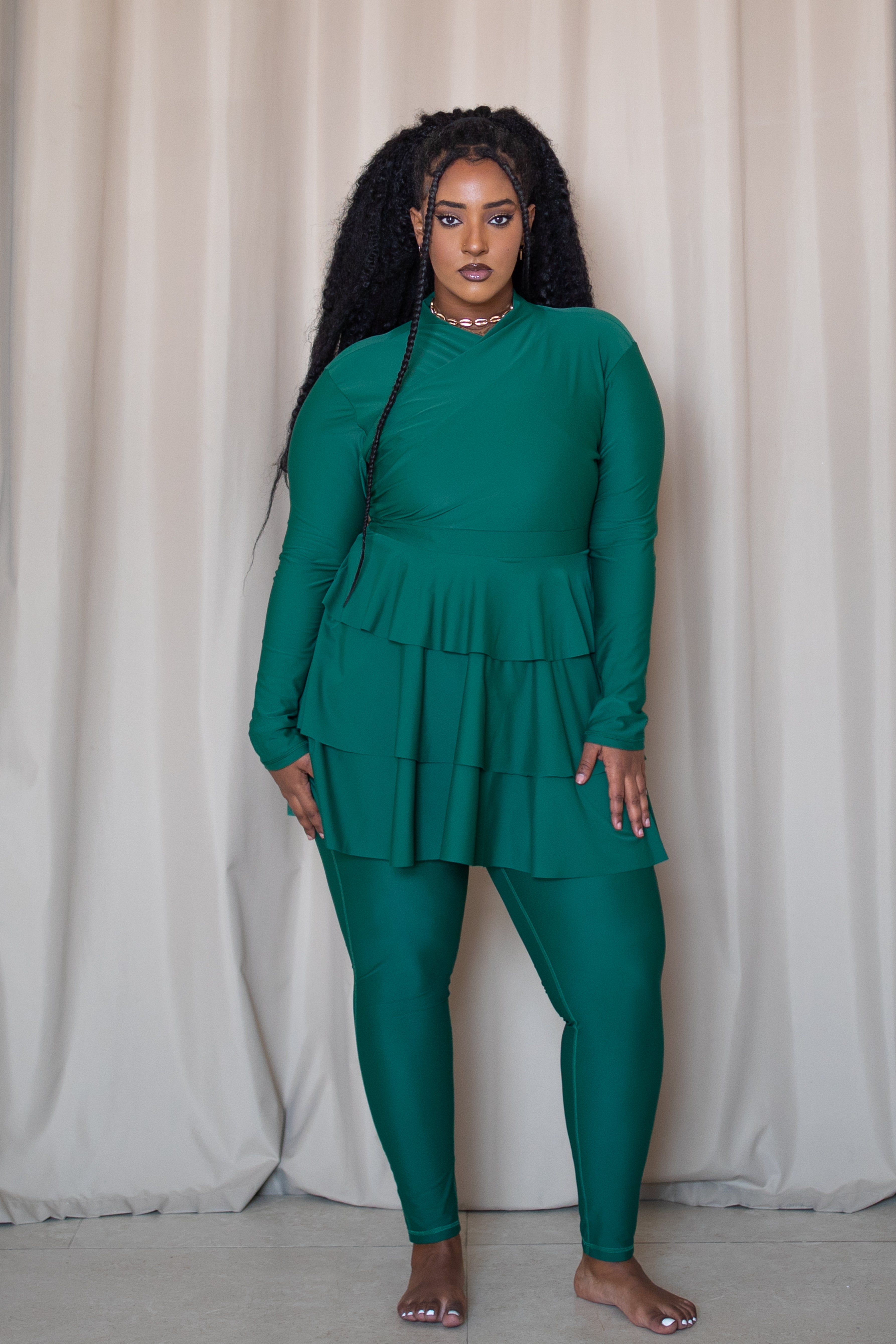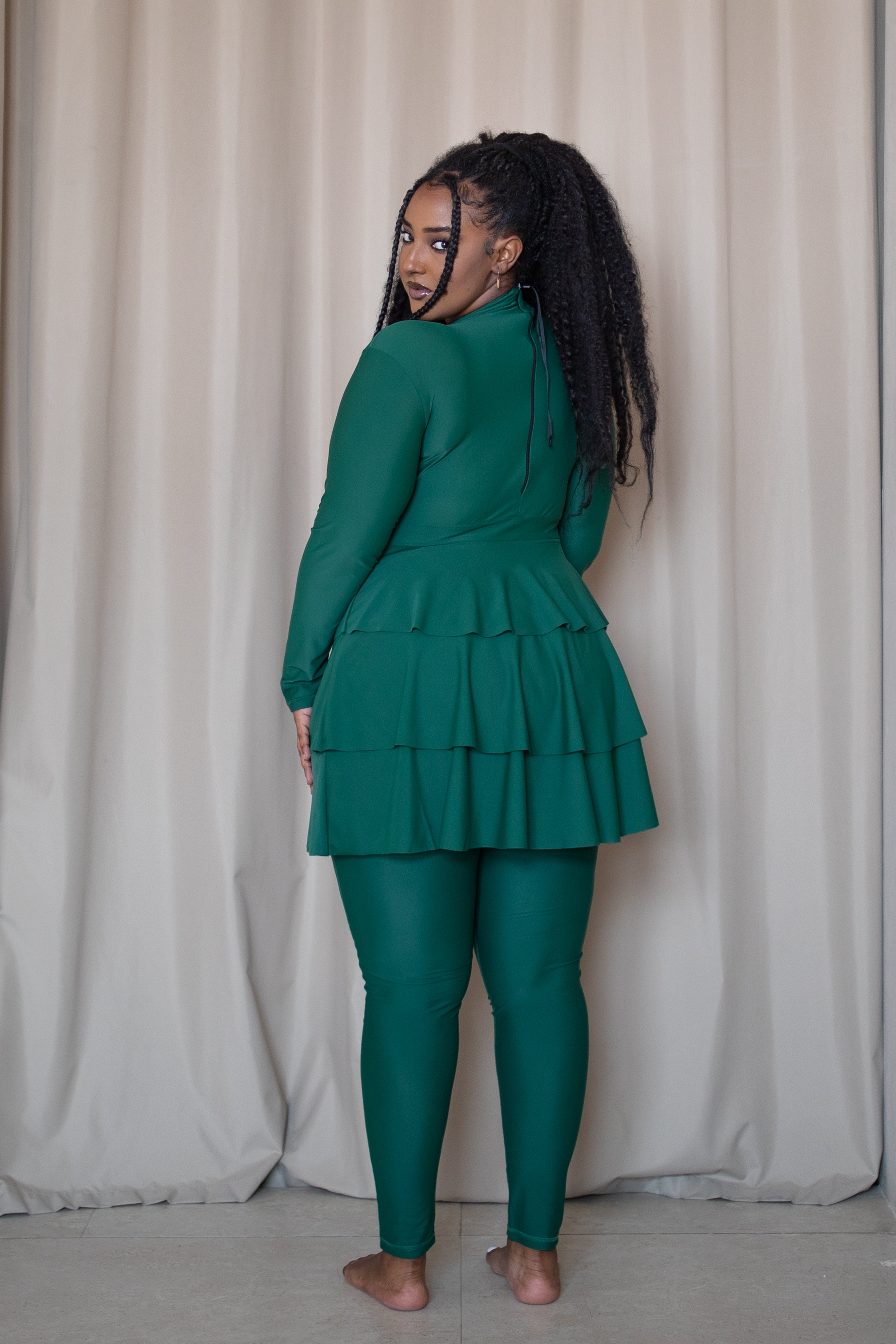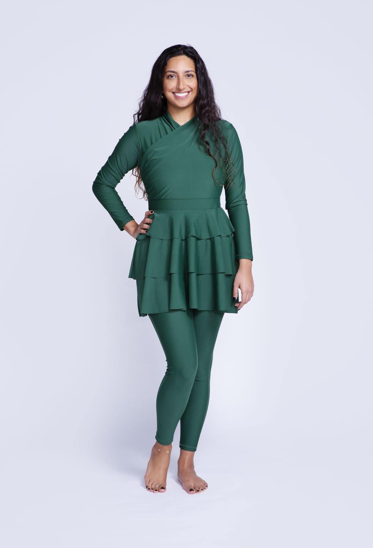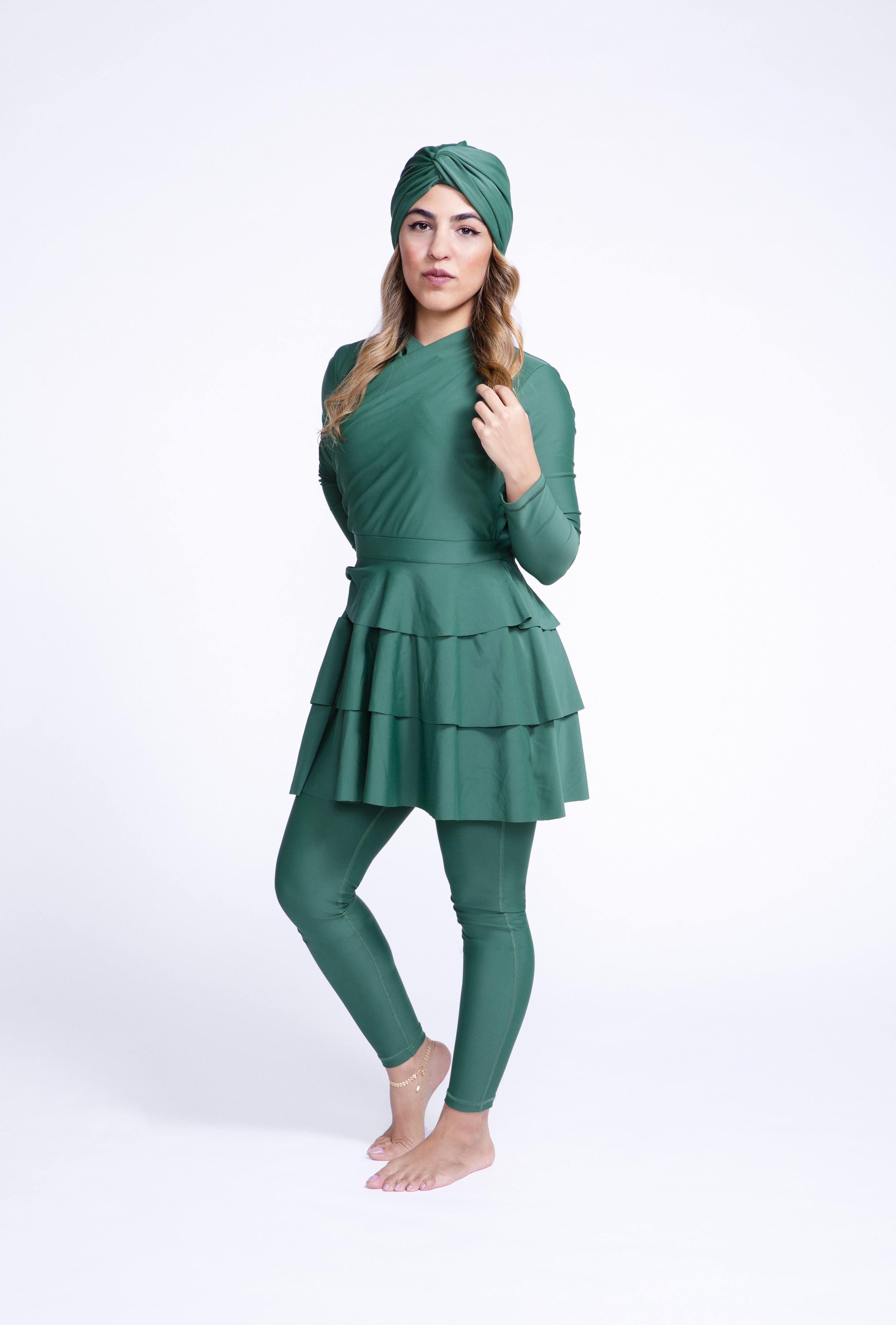 The LAILA design has three-layer peplum detail which will give you an added layer of protection and confidence by creating a more stylish and feminine silhouette. Laila is available in three colours: green, black and burgundy.All our swimsuits are sold with a top, pants and black turban. Model one wears...